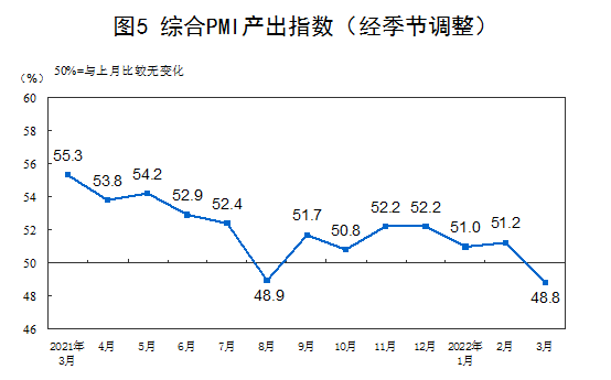 3月份,综合PMI产出指数为48.8%,比上月下降2.4个百分点,表明我国企业生产经营景气水平有所下降。