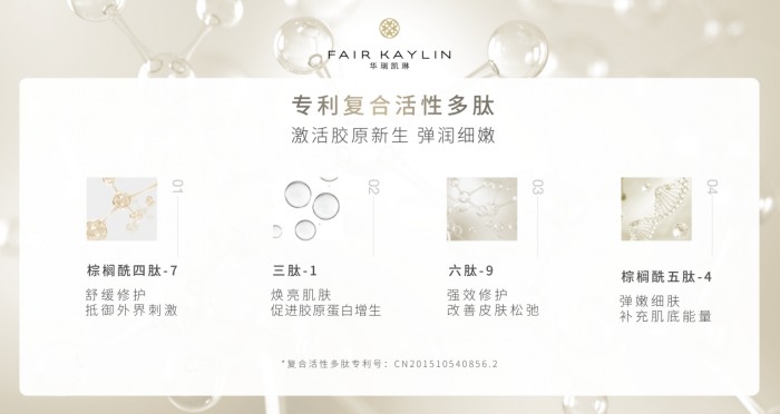 以棕榈酰四肽-7、三肽-1、六肽-9、棕榈酰五肽-4为主的复合肽多靶点狙击肌肤问题,作用于表皮层、基底膜层和真皮层,能够促进细胞再生更新,激活胶原新生,重建组织和皮肤结构,强效修护,改善皮肤松弛,令肌肤焕亮细嫩更有光泽。