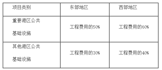 沿海港口公共基础设施建设支出,主要指用于沿海港口进出港航道、防波堤、锚地等基础设施建设支出。该项支出按项目法分配。其中:对于重要港区公共基础设施,东部地区、西部地区分别按工程费用的50%、60%补助;对于其他港区公共基础设施,东部地区、西部地区分别按工程费用的30%、40%补助。福建、广东两省原中央苏区县,海南省执行西部地区标准。2020年12月31日前交通运输部已出具项目资金意见函的“十三五”规划内建设项目(以下简称延续项目),具备开工条件后继续按照项目资金意见函核定的补助标准执行。