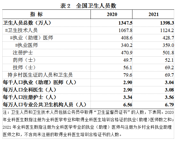 (三)卫生人员总数。2021年末,全国卫生人员总数1398.3万人,比上年增加50.8万人(增长3.8%)。