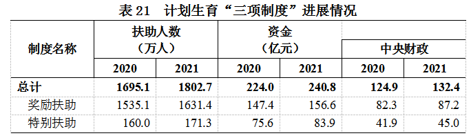 2021年出生人口1062万人。二孩占比为41.4%,三孩及以上占比为14.5%,出生人口性别比为110.9。2021年农村部分计划生育家庭奖励扶助制度受益1631.4万人;计划生育家庭特别扶助制度受益171.3万人。计划生育家庭奖励和扶助“三项制度”共投入资金240.8亿元,比上年增加16.8亿元;中央财政投入资金132.4亿元,比上年增加7.5亿元。