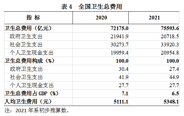 (四)卫生总费用。2021年全国卫生总费用初步推算为75593.6亿元,其中:政府卫生支出20718.5亿元,占27.4%;社会卫生支出33920.3亿元,占44.9%;个人卫生支出20954.8亿元,占27.7%。人均卫生总费用5348.1元,卫生总费用占GDP的比例为6.5%(见表4)。