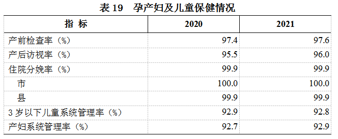 (一)妇幼保健。2021年,孕产妇产前检查率97.6%,产后访视率96.0%。与上年比较,产前检查率和产后访视率均有提高(见表19)。2021年住院分娩率为99.9%(市100.0%,县99.9%),基本实现全部住院分娩。