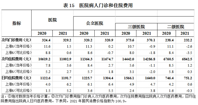 (一)医院病人医药费用。2021年,医院次均门诊费用329.2元,按当年价格比上年上涨1.5%,按可比价格上涨0.6%;次均住院费用11002.9元,按当年价格比上年上涨3.6%,按可比价格上涨2.7%。日均住院费用1191.7元(见表15)。
