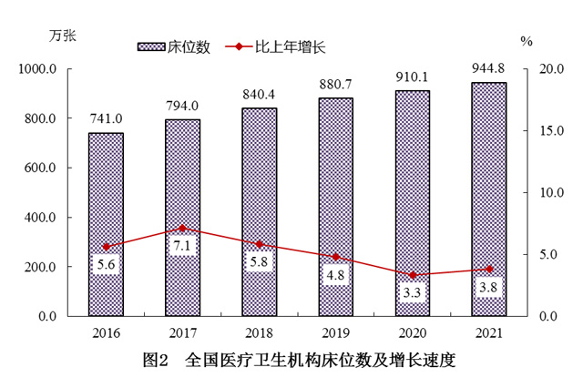 (二)床位数。2021年末,全国医疗卫生机构床位944.8万张,其中:医院741.3万张(占78.5%),基层医疗卫生机构171.2万张(占18.1%),专业公共卫生机构30.2万张(占3.2%)。医院中,公立医院床位占70.2%,民营医院床位占29.8%。与上年比较,床位增加34.8万张,其中:医院床位增加28.1万张(公立医院增加11.6万张,民营医院增加16.6万张),基层医疗卫生机构床位增加6.3万张,专业公共卫生机构床位增加0.6万张。每千人口医疗卫生机构床位数由2020年6.46张增加到2021年6.70张。