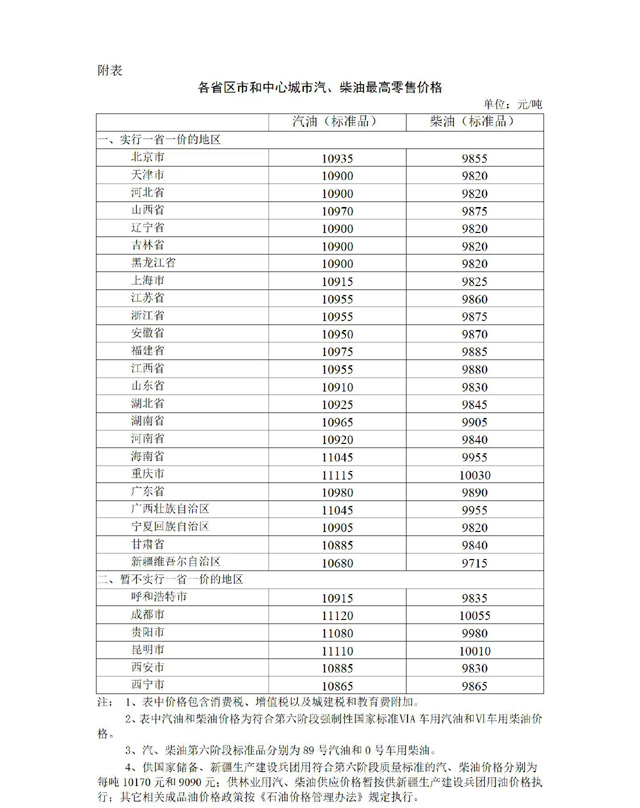 附:各省区市和中心城市汽、柴油最高零售价格
