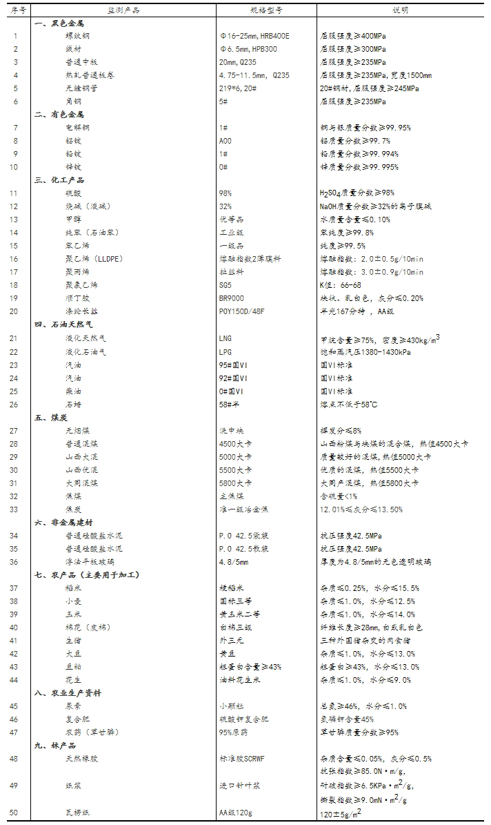 流通领域重要生产资料市场价格监测内容包括9大类50种产品的价格。类别与产品规格说明详见附表。