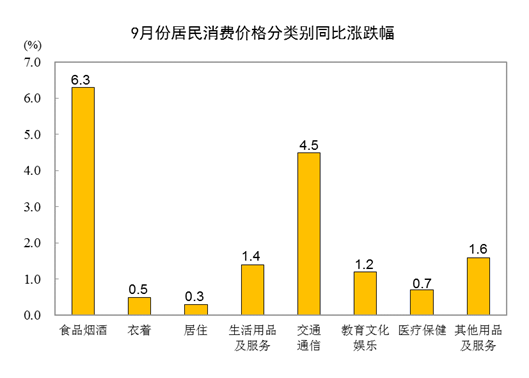 9月份,食品烟酒类价格同比上涨6.3%,影响CPI(居民消费价格指数)上涨约1.73个百分点。食品中,鲜果价格上涨17.8%,影响CPI上涨约0.31个百分点;畜肉类价格上涨16.0%,影响CPI上涨约0.50个百分点,其中猪肉价格上涨36.0%,影响CPI上涨约0.45个百分点;鲜菜价格上涨12.1%,影响CPI上涨约0.25个百分点;蛋类价格上涨7.3%,影响CPI上涨约0.05个百分点;粮食价格上涨3.6%,影响CPI上涨约0.06个百分点;水产品价格上涨2.8%,影响CPI上涨约0.06个百分点。