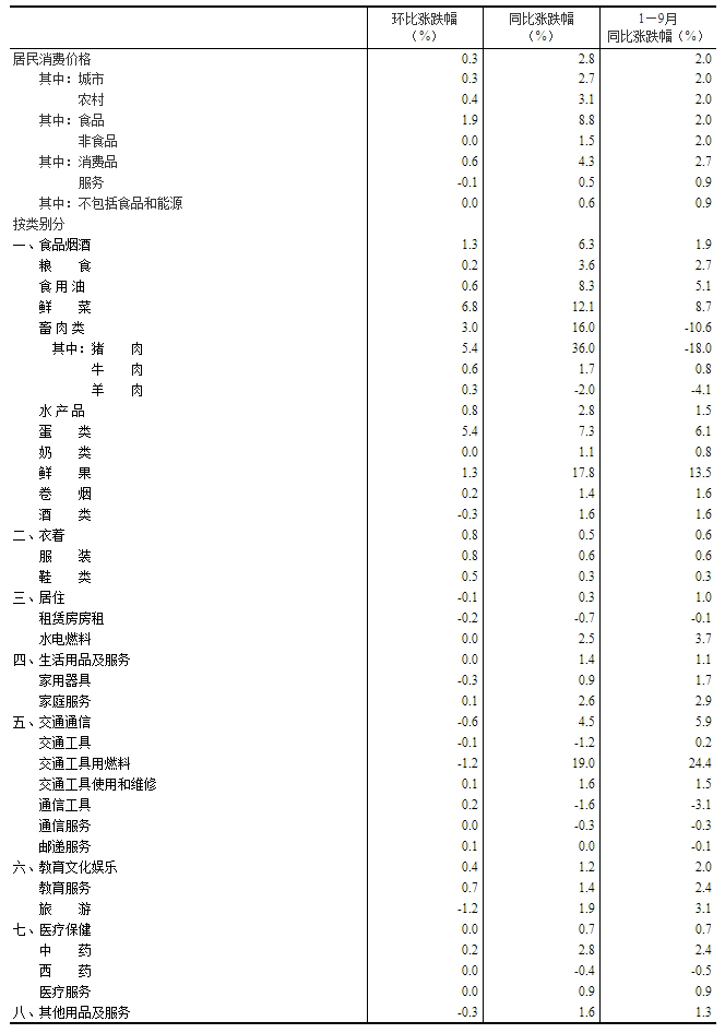 9月份,全国居民消费价格环比上涨0.3%。其中,城市上涨0.3%,农村上涨0.4%;食品价格上涨1.9%,非食品价格持平;消费品价格上涨0.6%,服务价格下降0.1%。