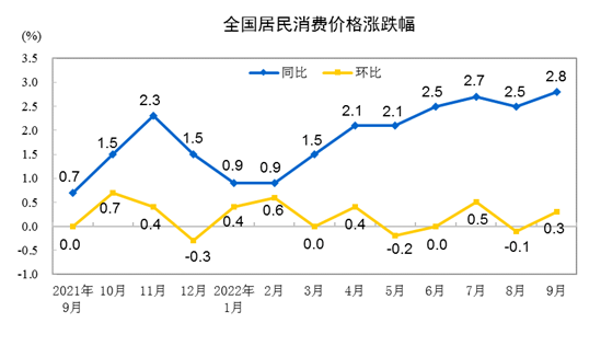 2022年9月份,全国居民消费价格同比上涨2.8%。其中,城市上涨2.7%,农村上涨3.1%;食品价格上涨8.8%,非食品价格上涨1.5%;消费品价格上涨4.3%,服务价格上涨0.5%。1—9月平均,全国居民消费价格比上年同期上涨2.0%。