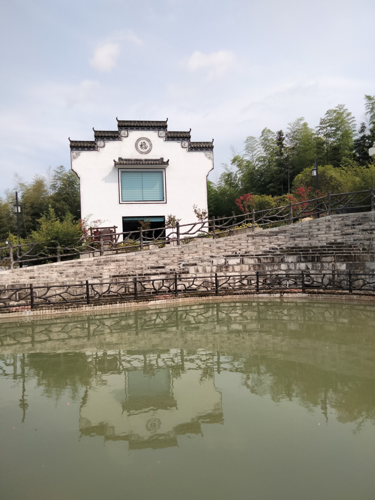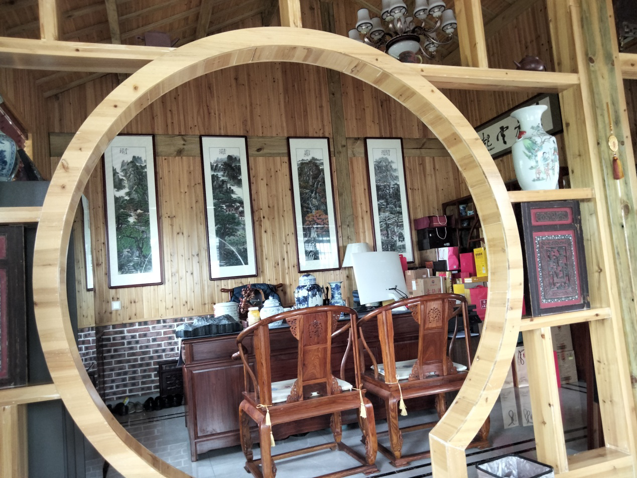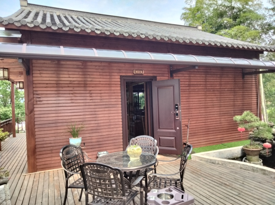 进入山居大门有砖雕展示墙,迎客松、百福图等,精美绝伦;沿坡上粉墙黛瓦的房舍、楼台亭阁、碧水石山、客房别墅、奇花异草等一一映入眼帘,一派诗情画意;这座园林别具一格,恬静风雅,高端大气。
