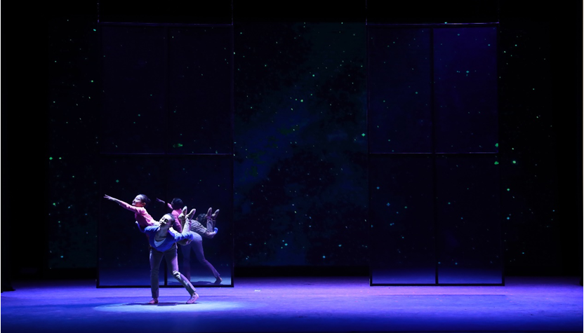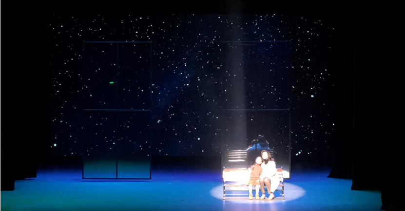 在第三幕第四场,母女坐在半透明的镜面前对话,透过半透明的镜面材质,观众可以看见远处的星空,又可以看见镜面中的母女面向星空的反向身影。