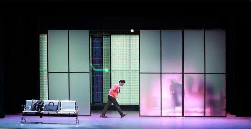 在剧中的舞台设计和舞台灯光方面,注重灯光作用在舞美材料方面的探索,探索性地运用一些舞美透光材料呈现舞台视觉形象,诸如演出中使用了半透明的镜面、磨砂玻璃、半透光的纱幕,通过不同的透光度的材料与装置和影像的结合,给观众带来新颖的视觉感受。在第一幕第三场抢救病房中,通过频闪灯由舞台后区底部向舞台前区照射,医生和护士在病房中紧急救人的影像被放大的投映在半透明的磨砂玻璃上,较为充分地体现出半透明磨砂玻璃的材质在光的作用下的效果。