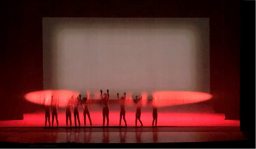 在第一幕第二场的《胎儿舞》中,一道纱幕隔挡在观众和舞蹈的小演员之间,在左右舞台暖色侧光的作用下,通过纱幕材质的透光性能,营造出一个儿童出生前的乐园——怀胎的母体空间。