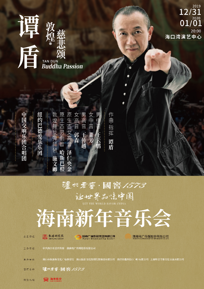 《敦煌·慈悲颂》海南新年音乐会,由谭盾亲自指挥,王云鹏(男中音)、董芳(女中音)、王传越(男高音)、郭森(女高音)、泽仁央金(原生态女高音)、哈斯巴根(原生态男低音)领衔演唱,施文卿表演敦煌舞反弹琵琶,来自全球艺术家组成的纽约巴德爱乐乐团、几乎与共和国同龄的中国交响乐团合唱团组建庞大演出阵容,力求为海南观众带来最完美的视听觉体验。