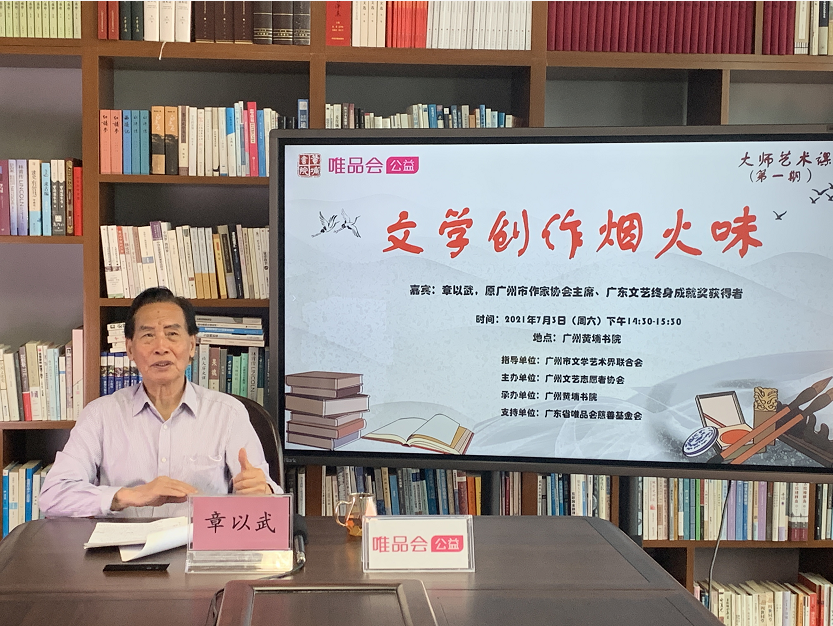 7月3日星期六下午,“大师艺术课”系列公益分享活动第一期,在广州黄埔书院成功开展。活动由广州市文学艺术界联合会指导,广州文艺志愿者协会主办,广州黄埔书院承办,并由广东省唯品会慈善基金会提供支持。本次活动邀请著名作家、第二届广东文艺终身成就奖获得者、广州市作家协会原主席章以武先生作为主讲嘉宾,通过视频直播分享“文学创作烟火味”,吸引广大读者朋友在线观看学习。