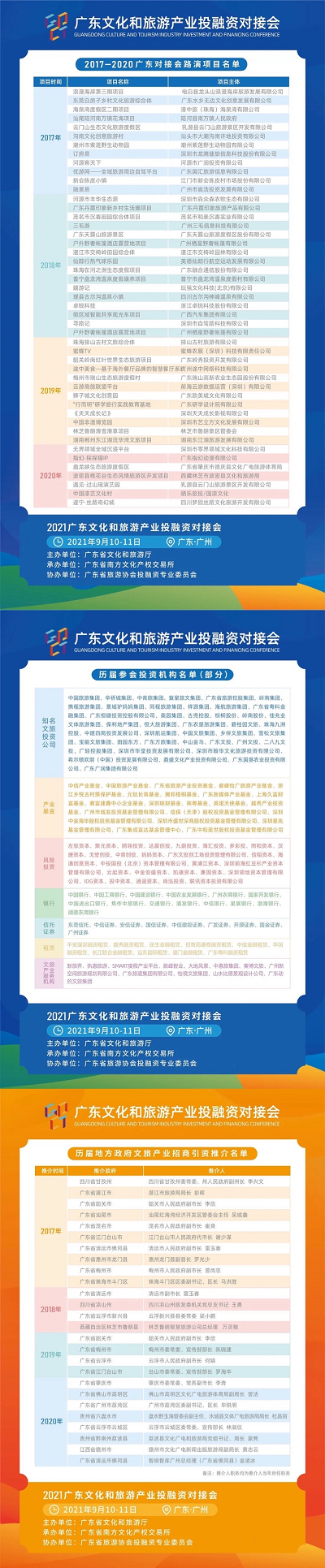 2017年9月,顺文旅产业与金融产业深度融合发展之势而起,广东文化和旅游产业投融资对接会(简称“广东对接会”)在广东省文化和旅游厅、广东省地方金融监督管理局的联合推动下应运而生,成为广东开创性打造的立足广东、辐射全国的省级文旅产融对接平台。