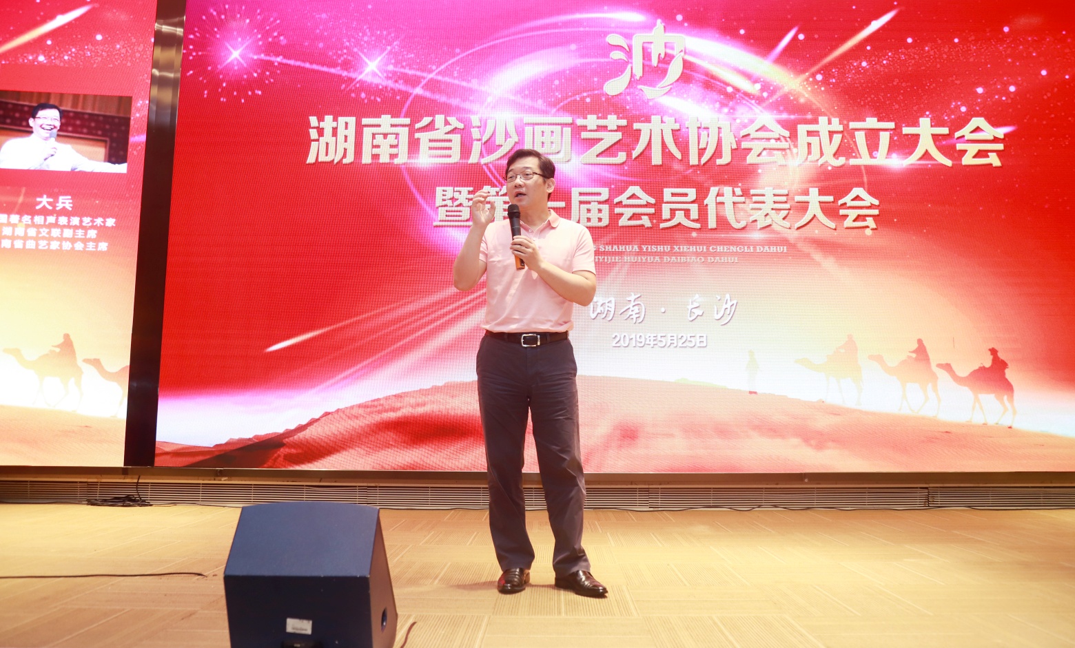 5月25日,湖南省沙画艺术协会成立大会暨第一届会员代表大会在长沙市蓉园宾馆隆重举行。来自省、市相关领导、各界专家学者、沙画师和沙画爱好者以及全国50家新闻媒体齐聚一堂,中国著名相声表演艺术家、湖南省文联副主席、湖南省曲艺家协会主席大兵、中国沙画创始人苏大宝作为大会的特邀嘉宾出席会议共同见证了这一历史时刻。