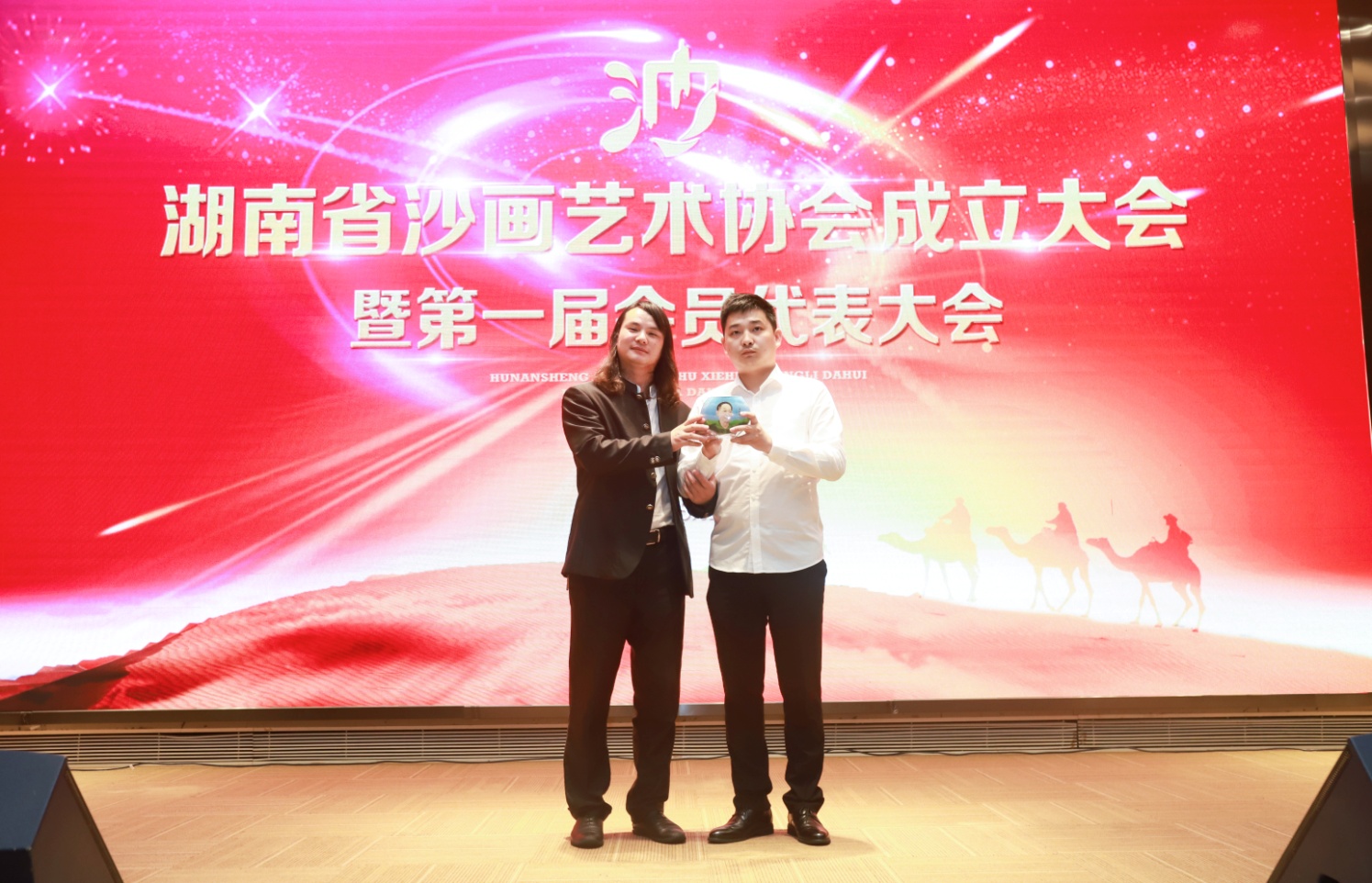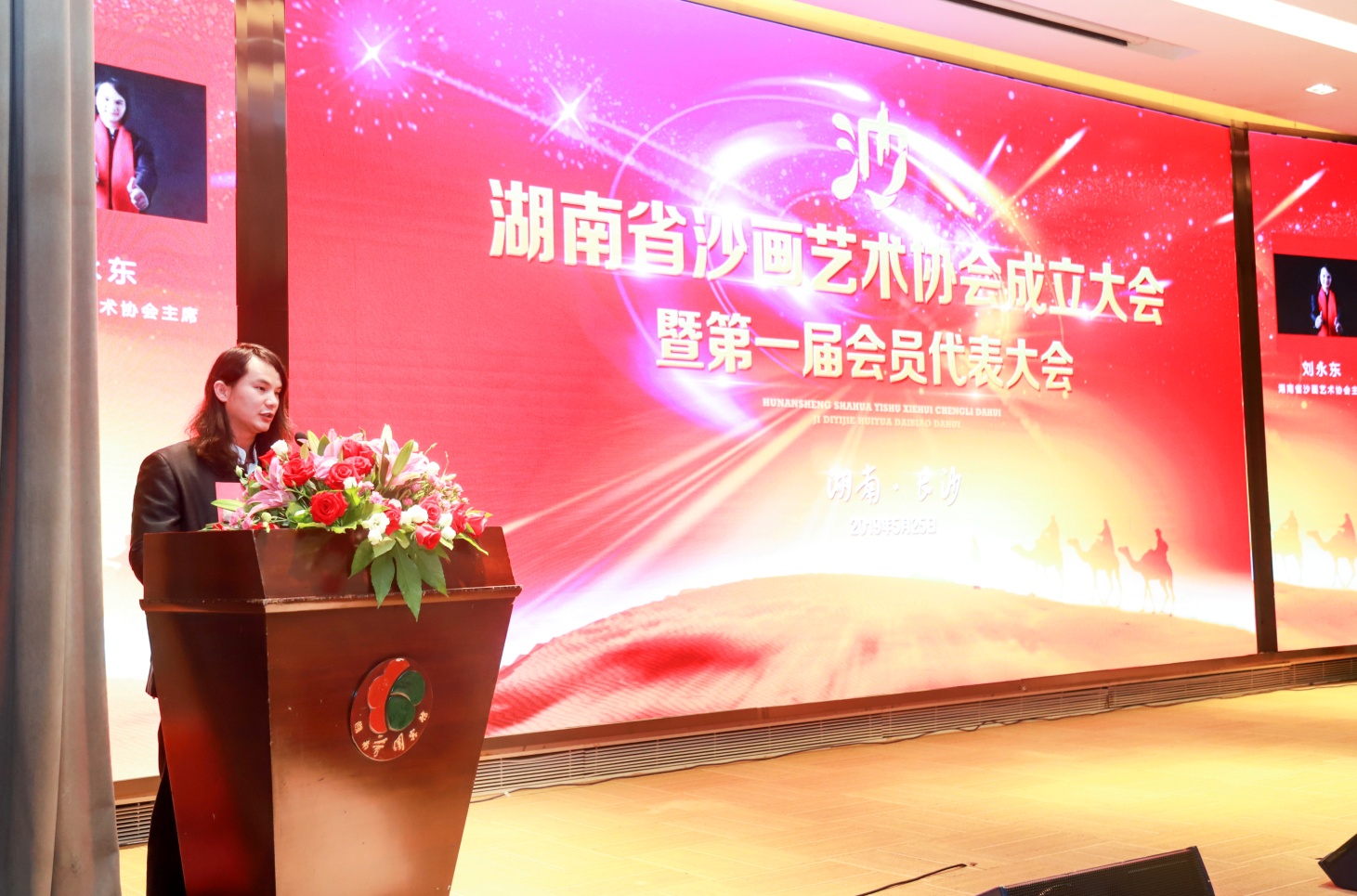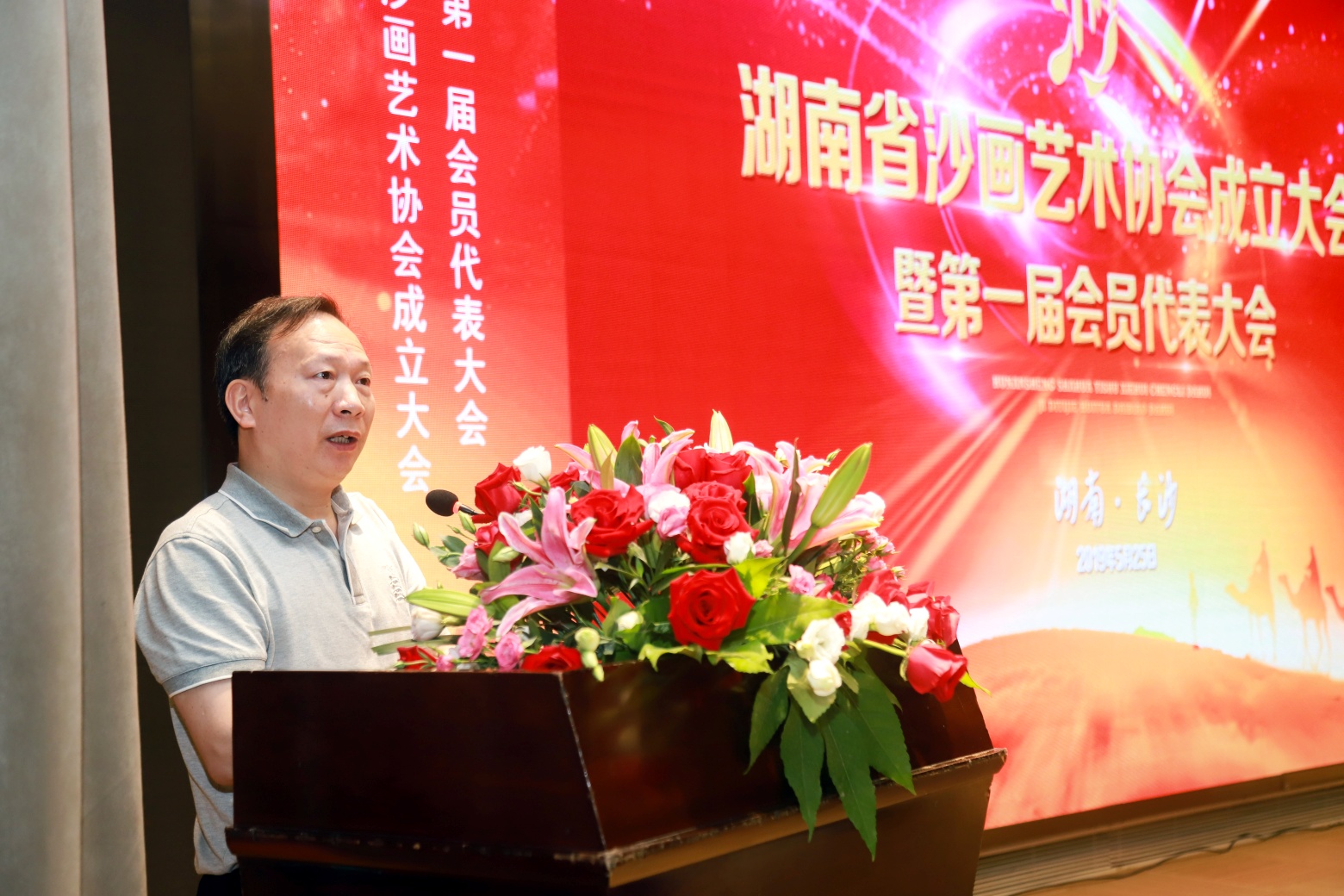 5月25日,湖南省沙画艺术协会成立大会暨第一届会员代表大会在长沙市蓉园宾馆隆重举行。来自省、市相关领导、各界专家学者、沙画师和沙画爱好者以及全国50家新闻媒体齐聚一堂,中国著名相声表演艺术家、湖南省文联副主席、湖南省曲艺家协会主席大兵、中国沙画创始人苏大宝作为大会的特邀嘉宾出席会议共同见证了这一历史时刻。