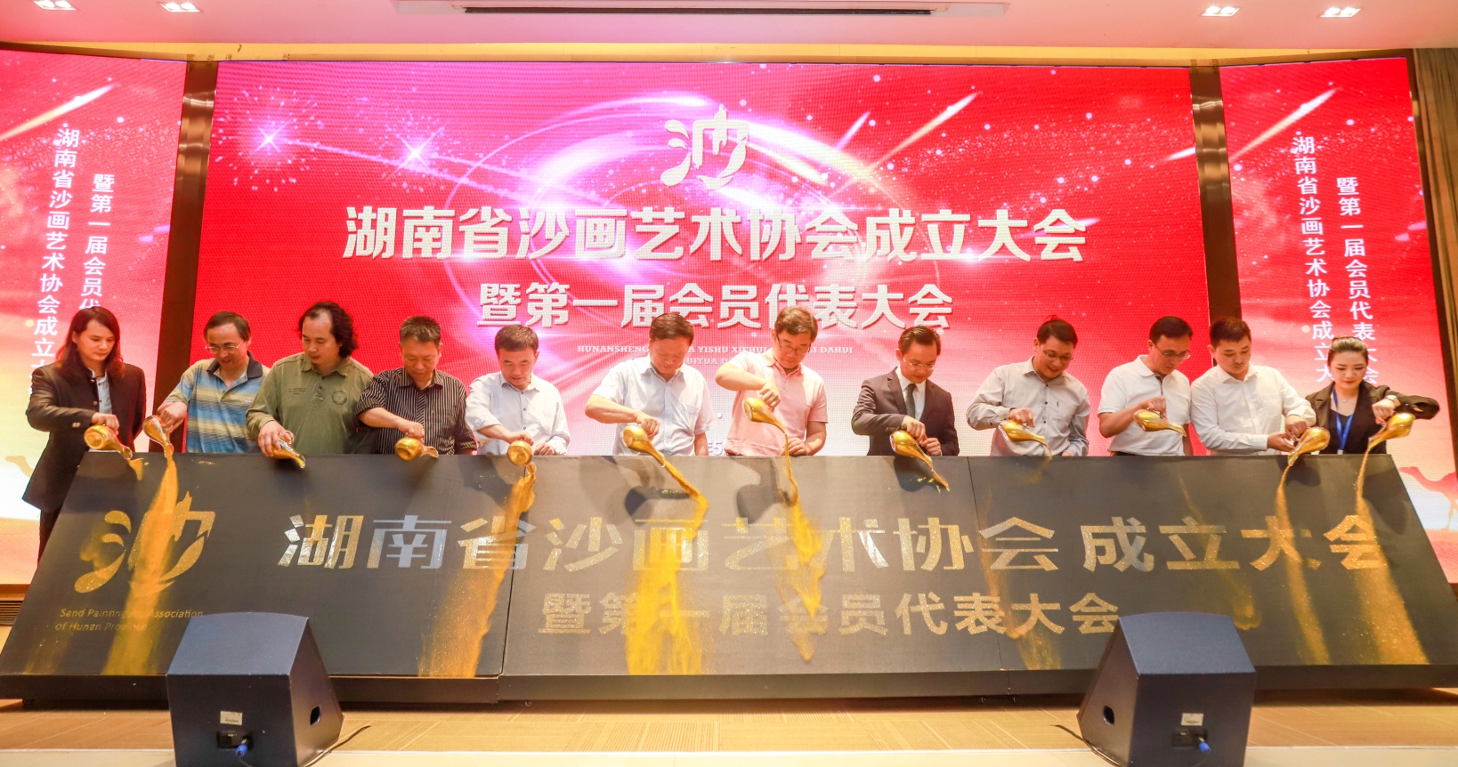 5月25日,湖南省沙画艺术协会成立大会暨第一届会员代表大会在长沙举行。会上,全体嘉宾共同鎏金倒金沙启动