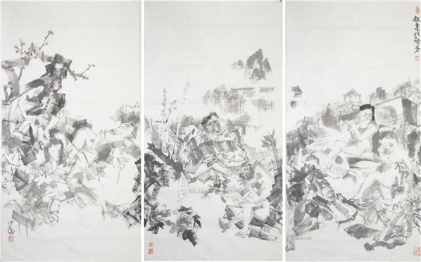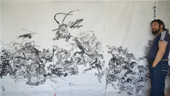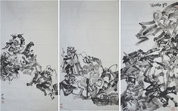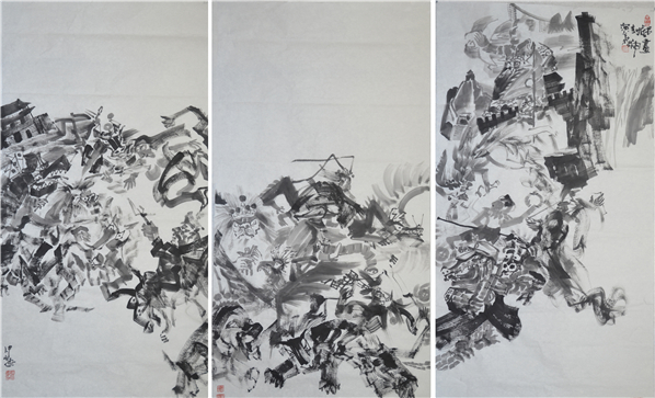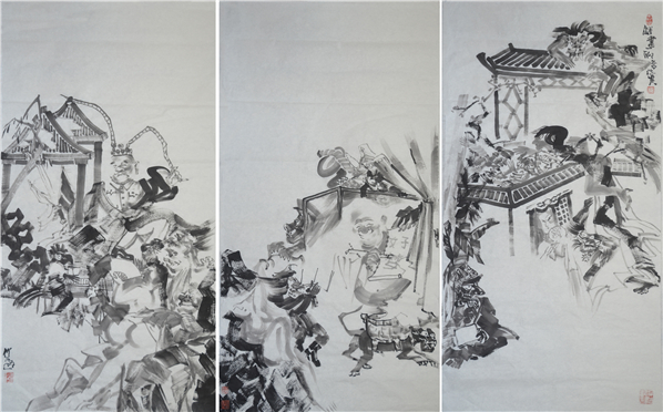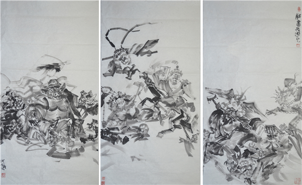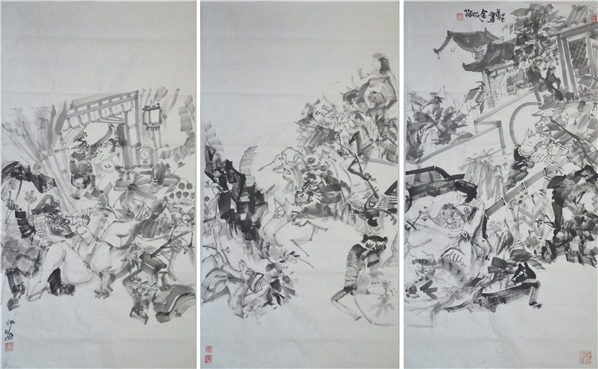 画家仲泊游20年前创作出一批以古典名著为题材的现实版作品,九十年代后期画家分别以水墨黑白联画、彩色没骨长卷,重彩联画等形式创作出“新古典名著”等大幅作品。