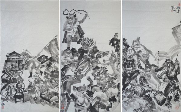 仲泊游当时在创作中吸收了汉代(动物头、人身)汉俑及民间杂戏脸谱,调侃荒诞的戏剧化的情节,串烧出一幅幅生动的社会画卷,使古典小说中的形象转换于现实舞台上。
