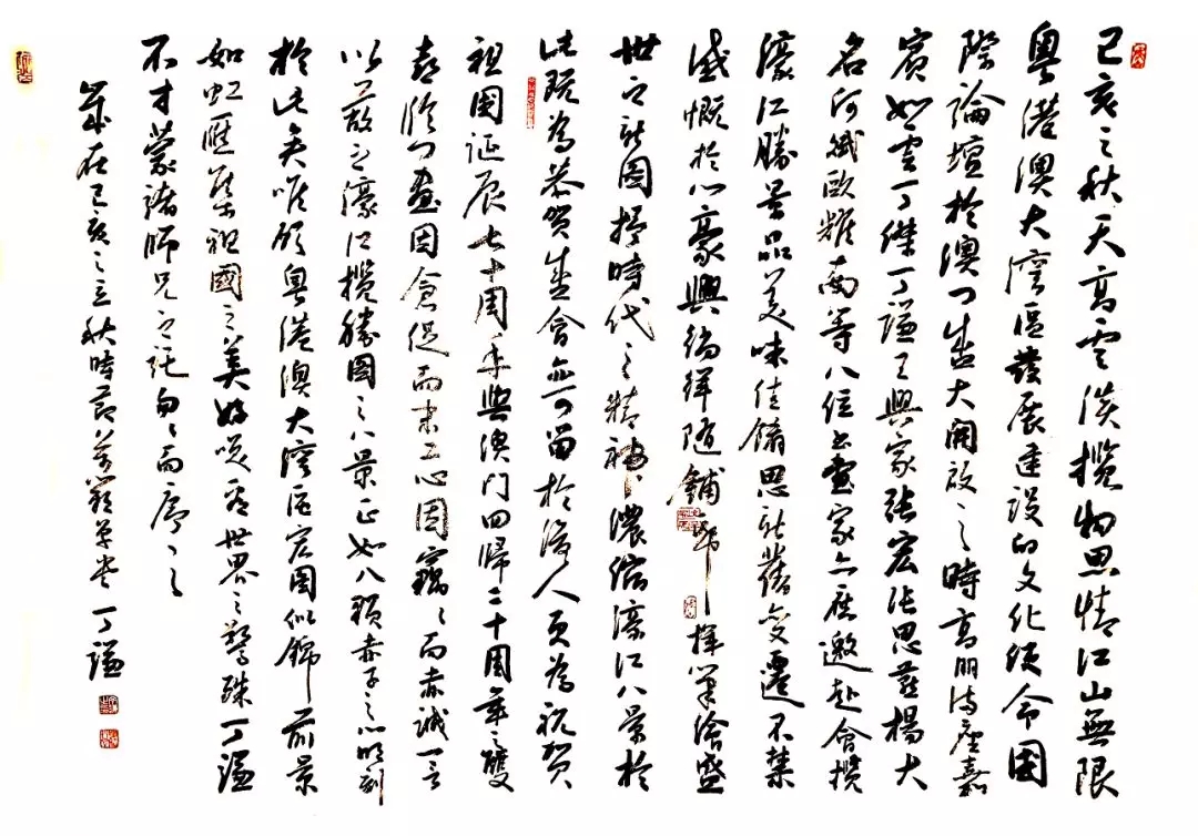 “己亥之秋,天高云淡,揽物思情,江山无限。粤港澳大湾区发展建设的文化使命国际论坛,于澳门盛大开启之时,高朋满座,嘉宾如云。丁杰、丁谦、王兴家,张弘、张思燕、杨大名、何斌、欧耀南等八位书画家亦应邀赴会。揽濠江胜景,品美味佳肴,思新旧变迁,不禁感慨于心,豪兴徜徉。随铺纸挥笔,绘盛世之新图,抒时代之精神,浓缩濠江八景于此,既为恭贺盛会,亦可留于后人,更为祝贺祖国诞辰七十周年与澳门回归二十周年之双喜临门。画因仓促而未工,心因切切而赤诚。一言以蔽之:所绘濠江揽胜图之八景,正如八颗赤子之心铭刻于此矣!唯愿粤港澳大湾区宏图似锦、前景如虹;汇集祖国之美好,笑看世界之惊殊!岁在己亥孟秋万籁草堂丁谦并书之。”