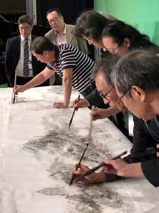 在论坛闭幕晚会上,丁谦等八位艺术家合作奉献了“濠江揽胜”巨幅画卷。丁谦先生还应邀为此画卷现场作了序。