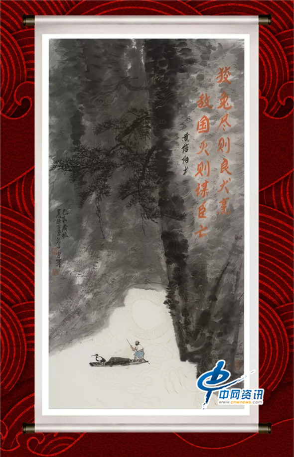 11、狡兔尽则良犬烹,敌国灭则谋臣亡。(画作上书法由黄信阳题写)