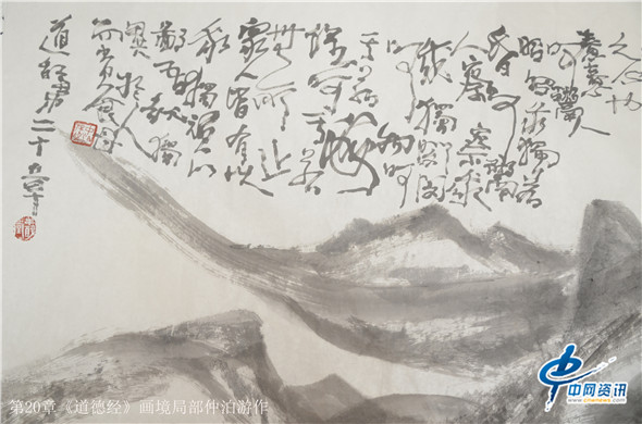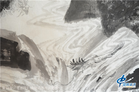 据了解,画家仲泊游自八十年代就研读老子《道德经》并把此书当做从事艺术创作的“大画论”座右铭,经过数年探寻、多年构思,终于把《道德经》以画作形式呈现出来。这些《道德经》画境作品,画幅宏大,水墨淋漓,宇宙山水,神秘之境,体现了远古的哲人对天地宏宇的探寻之境;阐述了画家仲泊游对经典的解读,以及用画笔诠释了老子的经典意境。