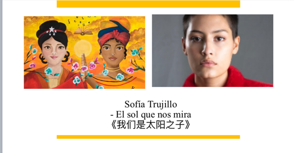 中国国礼画家、中国画院常务副院长,中国散文家协会副会长王红莉,对成人业余组特等奖特鲁希略创作的《我们是太阳之子》(SofíaTrujillo-Elsolquenosmira)格外喜爱,她说:两位少女,一位身着汉服,一位身着哥民族服装,青春亮丽,亲如姐妹。朝阳突破云层,光芒万丈,冉冉升起,花朵、祥云、音符、带有美好寓意的汉子飘来无限祝福,象征中哥友谊光明灿烂,欣欣向荣。