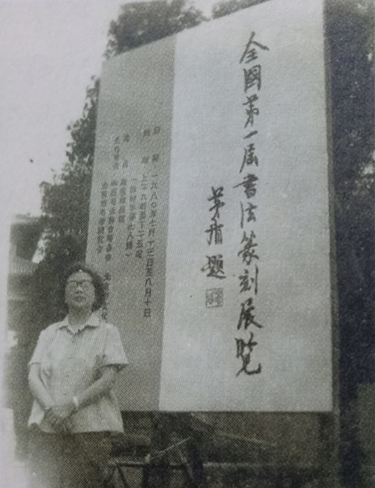 1980年7月,在北京故宫博物院举办的“全国第一届书法篆刻展览”展牌前,中国书法家协会发起人、创始人李文放先生留影。