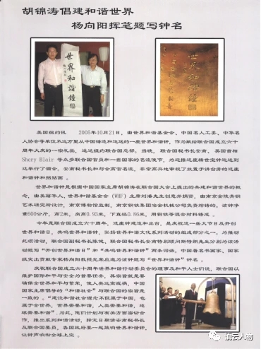 2005年胡锦涛主席倡导和谐世界,并请父亲为《世界和谐钟》题写钟名,铸成铜钟《世界和谐钟》赠予联合国安南秘书长。让钟声永远响彻全球上空。