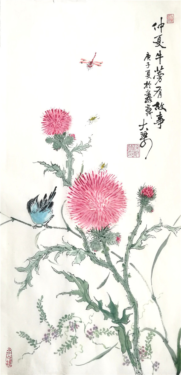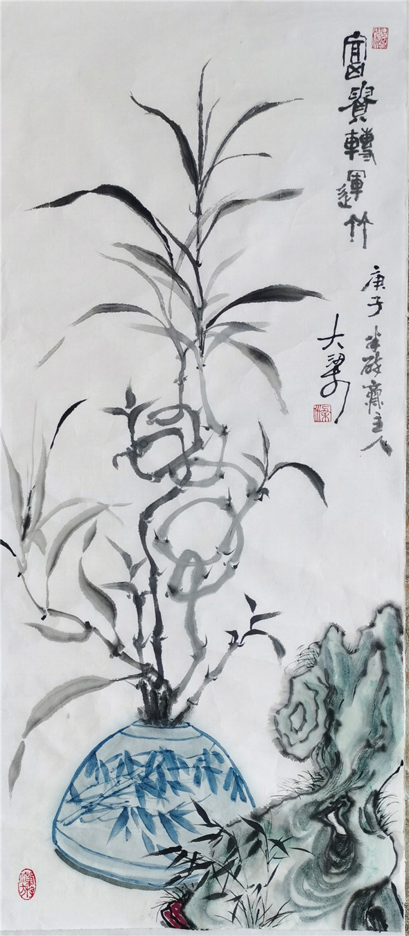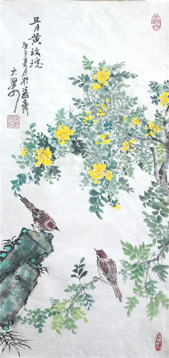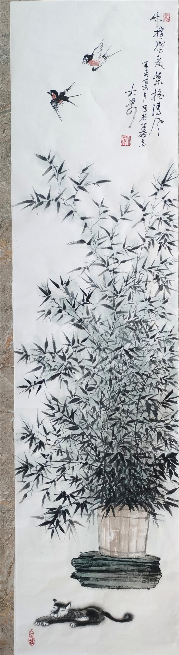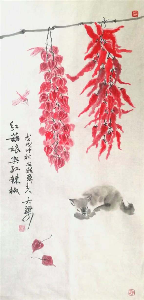 综上观之,可见大梁先生在题材上注重地方的一草一木,贴进百姓的日常生活,多是他们的身边事物,?且大梁本人对其也非常熟悉,热爱,加之细心观察,提练,注入人性化。从技法上看,他传统功力深厚,书法用笔活泼多变,线条质量高,为造型打下坚实基础,线条精到,下笔果断。对水墨理解深刻,运用灵活适度,为作品的生命力提供支撑。他的画多样性,重复干画一面的极少,又颇具个性,加之题款题诗与简练结构,使其作品有强烈的文人气息扑面而来。