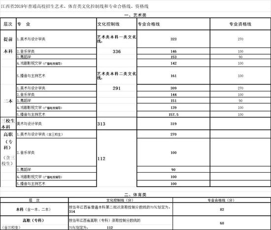 2019年我省艺术、体育类各批次文化录取控制线和专业合格线、资格线: