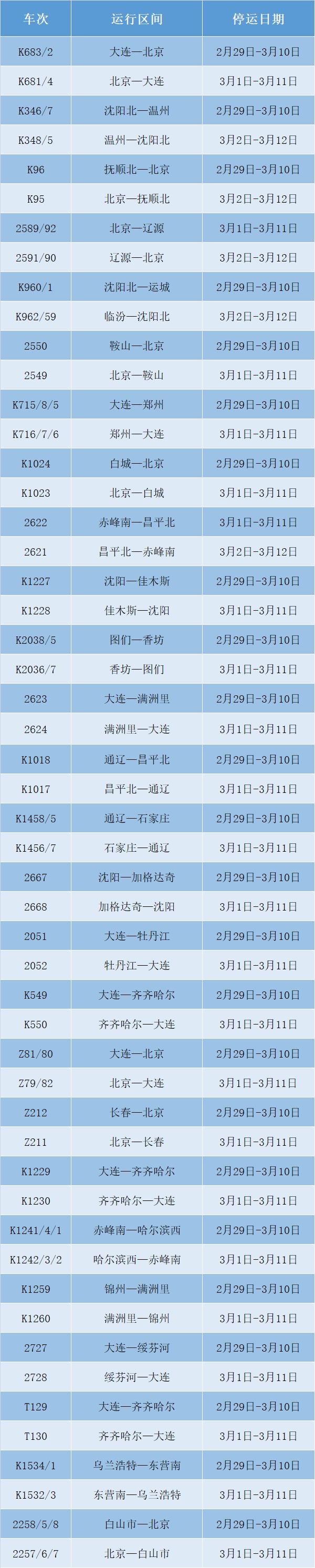 为应对疫情防控,中国铁路沈阳局集团公司根据旅客出行需求变化,调整优化列车开行方案,对部分旅客列车采取接续停运措施,对66趟旅客列车接续停运。