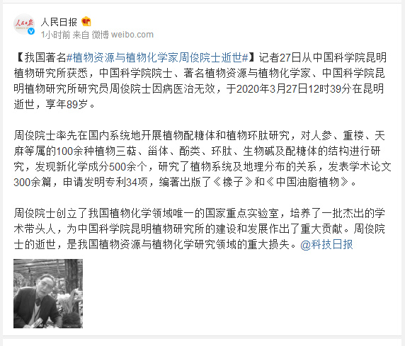 记者27日从中国科学院昆明植物研究所获悉,中国科学院院士、著名植物资源与植物化学家、中国科学院昆明植物研究所研究员周俊院士因病医治无效,于2020年3月27日12时39分在昆明逝世,享年89岁。