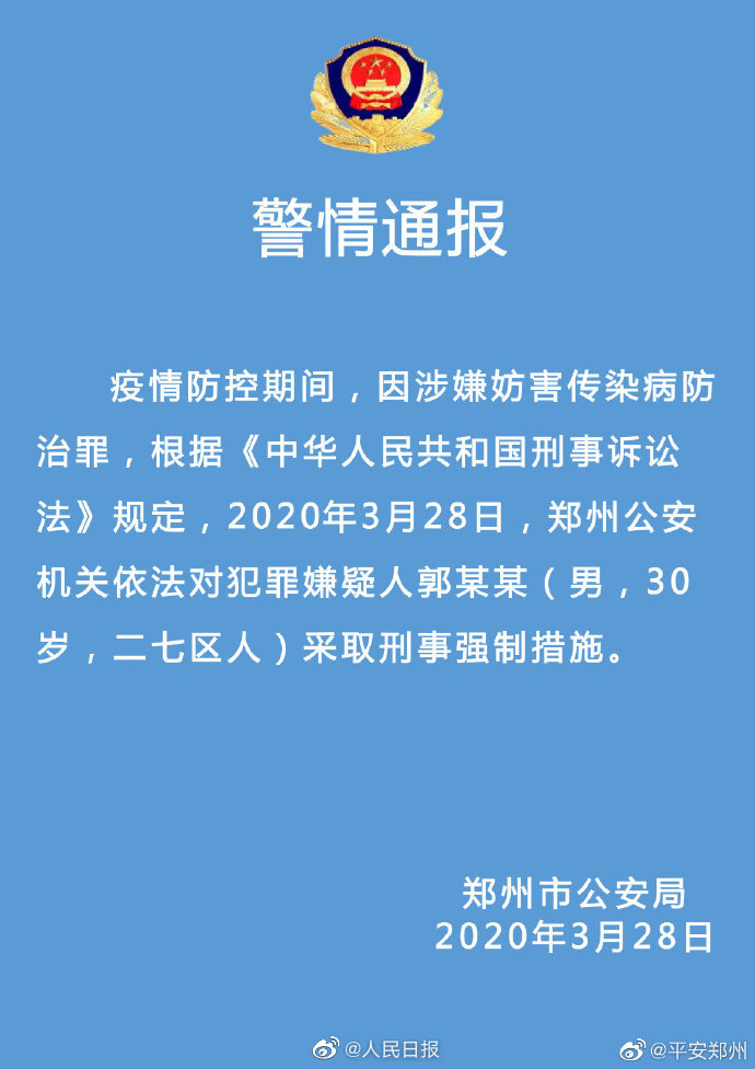 据@平安郑州 通报,疫情防控期间,因涉嫌妨害传染病防治罪,根据《中华人民共和国刑事诉讼法》规定,2020年3月28日,郑州公安机关依法对犯罪嫌疑人郭某某(男,30岁,二七区人)采取刑事强制措施。