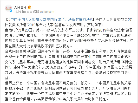 当地时间3月26日,美方不顾中方的多次严正交涉,将所谓“2019年台北法案”签署成法。此举严重违反一个中国原则和中美三个联合公报规定,严重违反国际法和国际关系基本准则,粗暴干涉中国内政,向“台独”分裂势力发出严重错误信号。中国全国人大对此表示强烈不满和坚决反对。