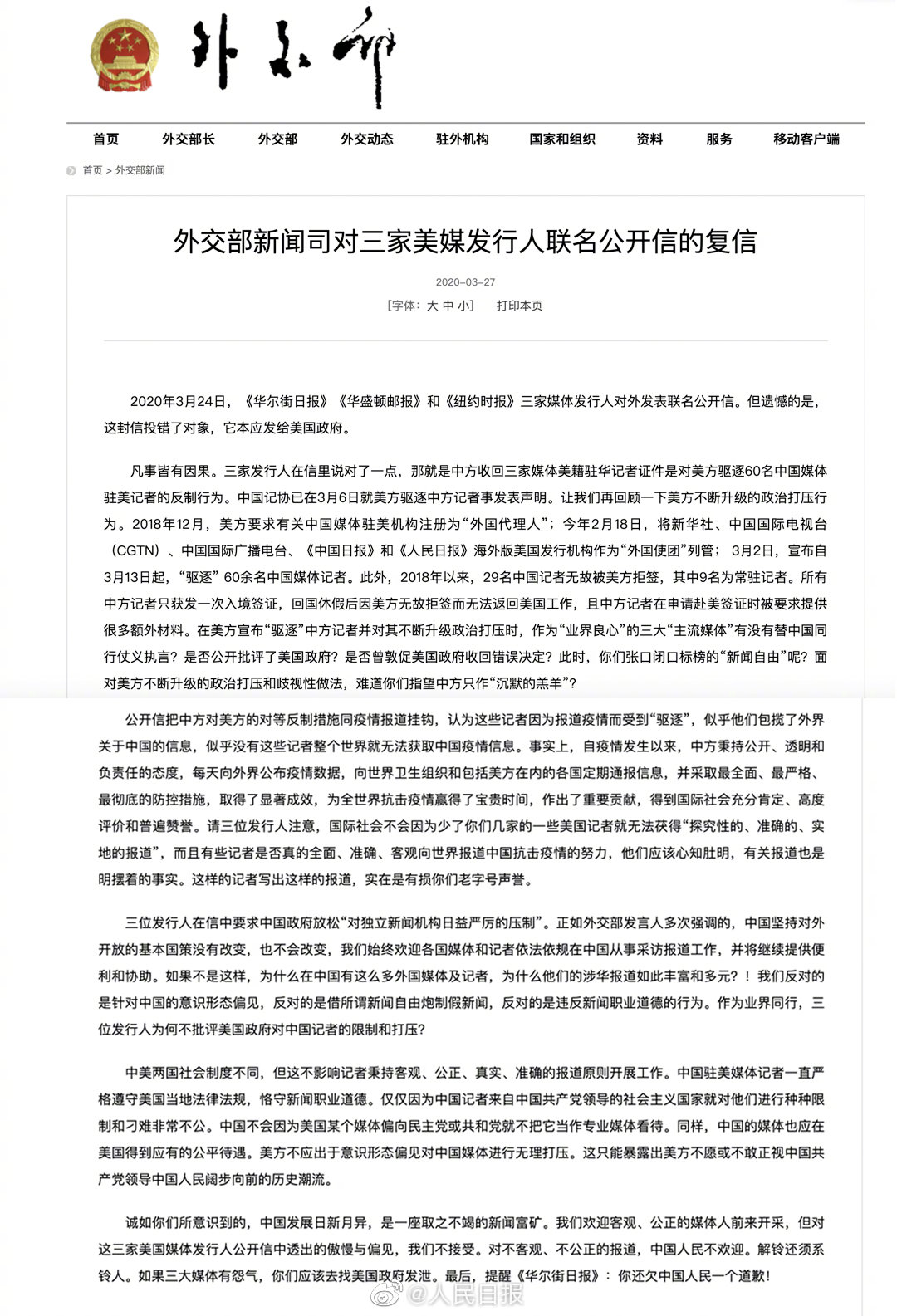 针对《华尔街日报》《华盛顿邮报》《纽约时报》三家媒体发行人发表联名公开信,外交部复信表示:凡事皆有因果。三家发行人在信里说对了一点,那就是中方收回三家媒体美籍驻华记者证件是对美方驱逐60名中国媒体驻美记者的反制行为。在美方宣布“驱逐”中方记者并对其不断升级政治打压时,作为“业界良心”的三大“主流媒体”有没有替中国同行仗义执言?你们张口闭口标榜的“新闻自由”呢?难道你们指望中方只作“沉默的羔羊”?我们欢迎客观、公正的媒体人前来开采,但对这三家美国媒体发行人公开信中透出的傲慢与偏见,我们不接受。对不客观、不公正的报道,中国人民不欢迎。解铃还须系铃人。如果三大媒体有怨气,你们应该去找美国政府发泄。最后,提醒《华尔街日报》:你还欠中国人民一个道歉!