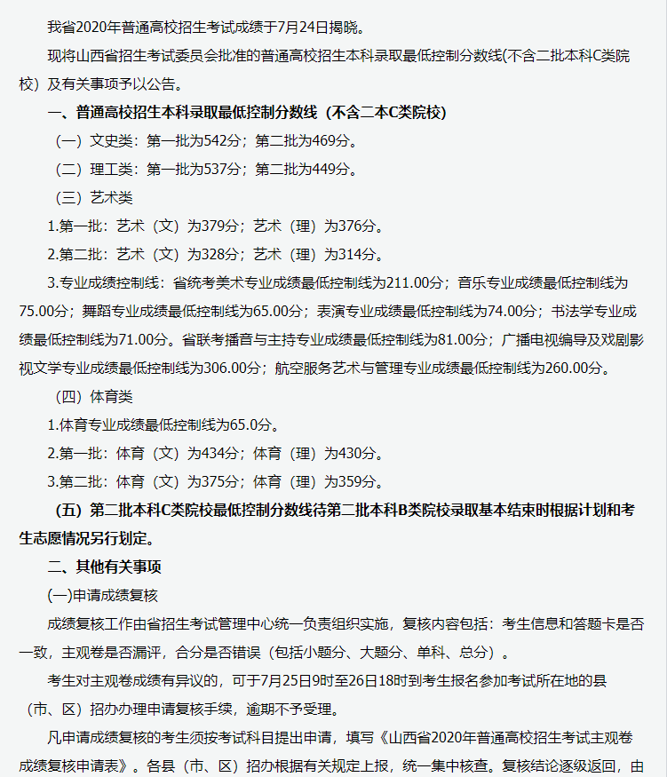 山西省2020年高考分数线已公布,详情如下: