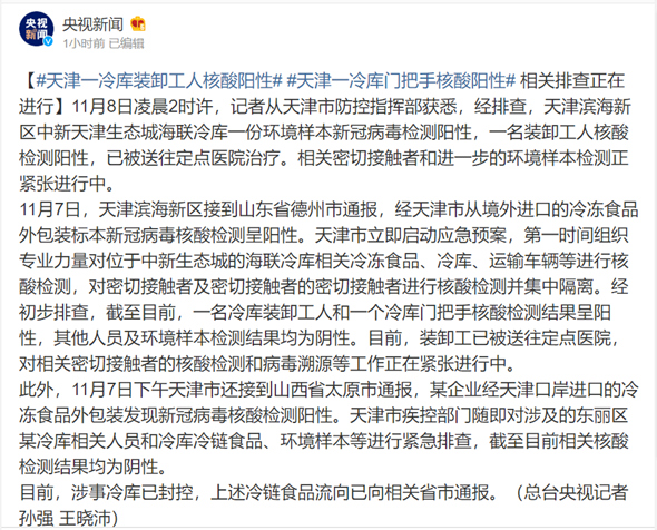 11月7日,天津滨海新区接到山东省德州市通报,经天津市从境外进口的冷冻食品外包装标本新冠病毒核酸检测呈阳性。天津市立即启动应急预案,第一时间组织专业力量对位于中新生态城的海联冷库相关冷冻食品、冷库、运输车辆等进行核酸检测,对密切接触者及密切接触者的密切接触者进行核酸检测并集中隔离。经初步排查,截至目前,一名冷库装卸工人和一个冷库门把手核酸检测结果呈阳性,其他人员及环境样本检测结果均为阴性。目前,装卸工已被送往定点医院,对相关密切接触者的核酸检测和病毒溯源等工作正在紧张进行中。