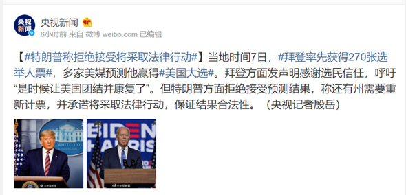 【#特朗普称拒绝接受将采取法律行动#】当地时间7日,#拜登率先获得270张选举人票#,多家美媒预测他赢得#美国大选#。拜登方面发声明感谢选民信任,呼吁“是时候让美国团结并康复了”。但特朗普方面拒绝接受预测结果,称还有州需要重新计票,并承诺将采取法律行动,保证结果合法性。(央视记者殷岳)