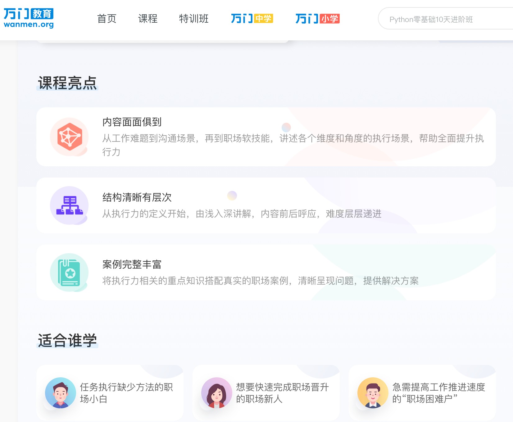 万门大学凭借其前沿的教学理念和极具特色的课程设计成为互联网在线教育培训行业中的佼佼者,备受初入职场人士及资深职场人士的认可与青睐。万门大学面向即将迈入职场的用户量身打造职业路径课程体系。初衷就是帮助致力从事相关专业的用户,以最佳的学习体验和最清晰的职业上升路径为目标,为今后工作打下坚实的基础。
