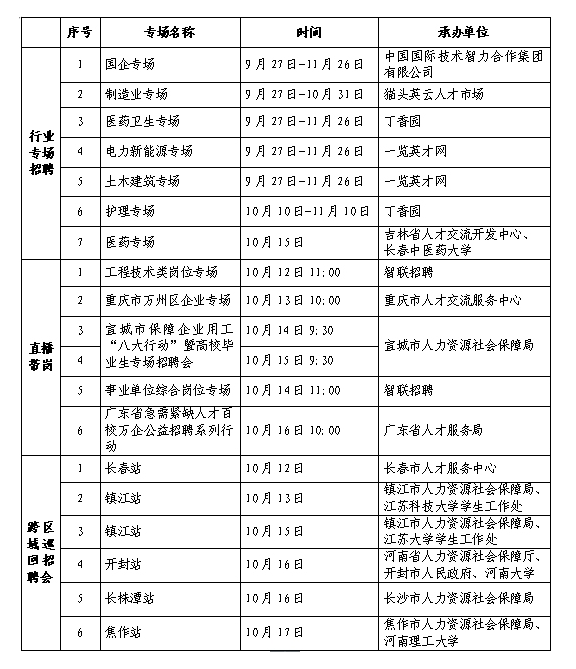 线下活动6场:举办长春站、镇江站(2场)、开封站、长株潭站、焦作站6场跨区域巡回招聘会,除本地用人单位外,将邀请外省市人社部门组织用人单位组团参加。