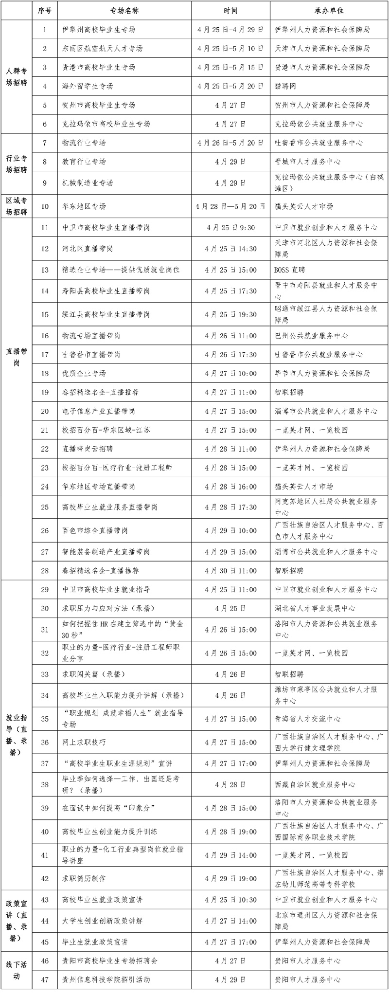 近日,人社部2022年大中城市联合招聘高校毕业生专场活动将陆续推出第七批共47场特色服务活动。其中,线上活动45场,包括海外留学生专场、物流行业、教育行业、机械制造业等线上专场招聘会10场,直播带岗18场,网上求职技巧、高校毕业生创业能力提升训练、求职简历制作等就业指导和政策宣讲直播(录播)课17场。线下活动2场,分别是贵阳市高校毕业生专场招聘会和贵州信息科技学院招引活动。