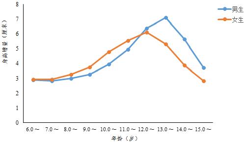 图1 十年来监测地区6~15岁各年龄段学生平均身高增量