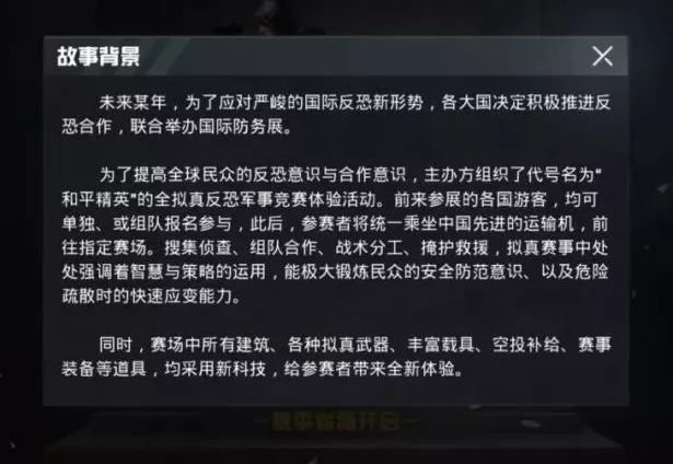 除此之外,游戏内容上为了合规化的改动也就更多了。打开《和平精英》,最先进入视线的,就是几段全新的故事背景: