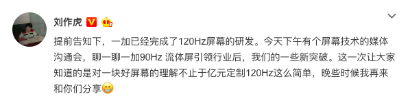 1月13日上午,一加科技CEO刘作虎在微博宣布,一加目前已经完成了120Hz刷新率屏幕的研发。这是继去年一加7 Pro推出引领行业的90Hz流体屏后,一加推动高帧屏幕发展的又一重要举措。刘作虎还在微博中称,一加对于一块好屏幕的理解并不止于120Hz这么简单,还将带来更多屏幕技术上的新突破。