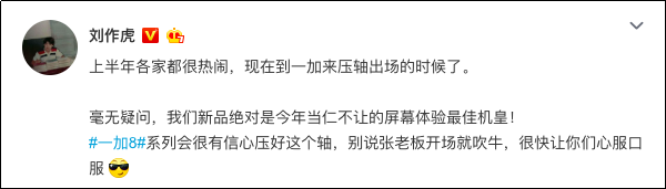 此前,刘作虎在微博上表示“一加8系列看来是手机行业上半年的压轴大戏”,相信一加8系列还将带来更多惊喜,敬请期待4月16日一加新品发布会。